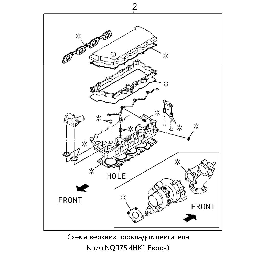 Данный верхний набор прокладок предназначен для капитального ремонта верхней части двигателя 4HK1 (5,2 л, Common Rail, Евро-3), устанавливаемого на грузовые автомобили :