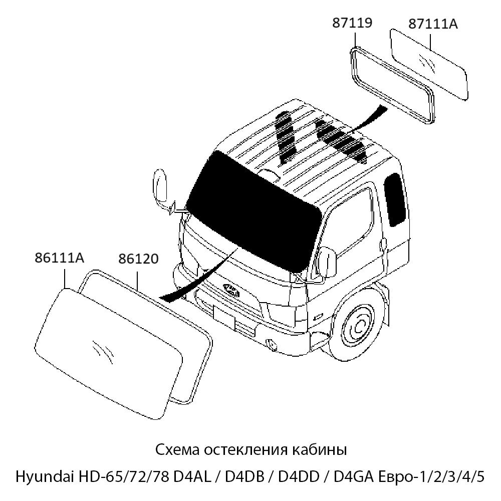 Лобовое стекло для автомобилей Hyundai HD-65/72/78, двигателей D4AL/D4DB/D4DD/D4GA, классов Евро-1/2/3/4/5. Прочное, прозрачное, безопасное триплекс-стекло для максимальной видимости и защиты водителя и пассажиров.