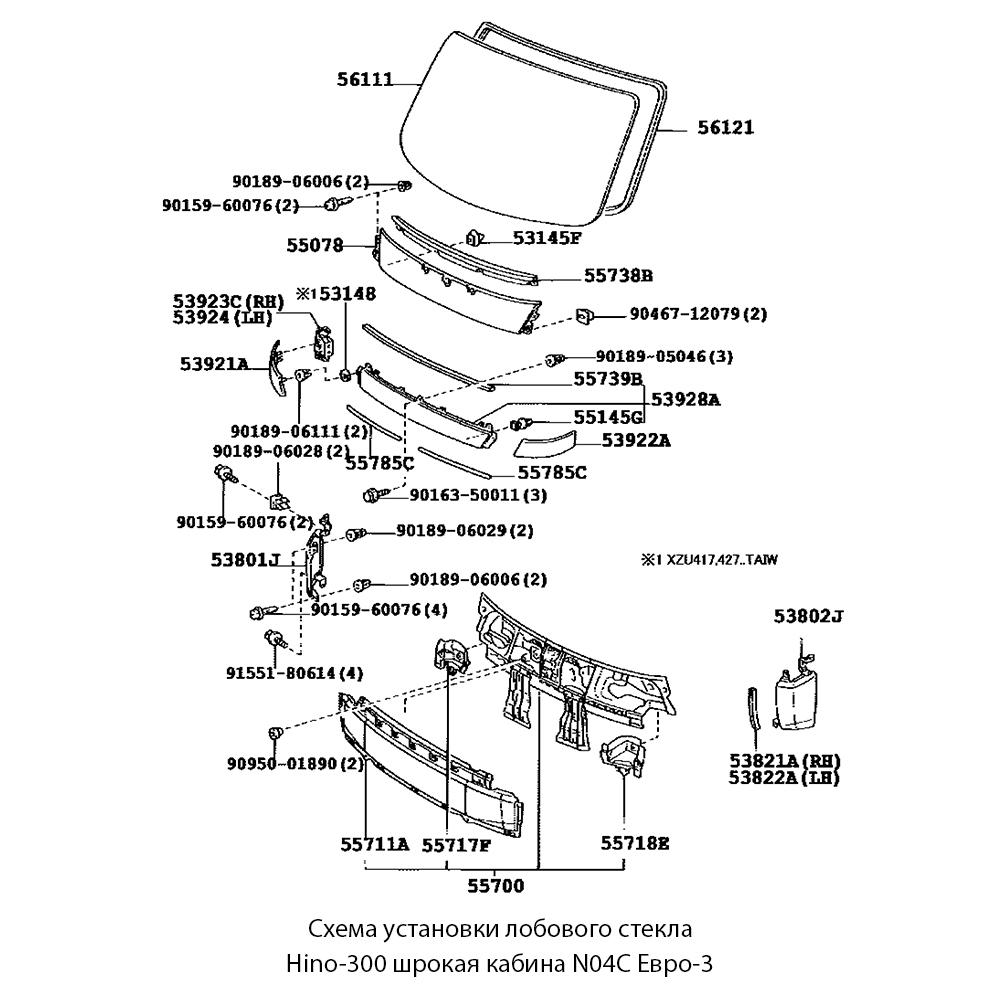 Артикул: HINT0001Лобовое стекло для широкой кабины автомобилей Hino-300 с двигателем N04C, соответствующего экологическому стандарту Евро-3. Товар выпущен компанией KMK-Glass.