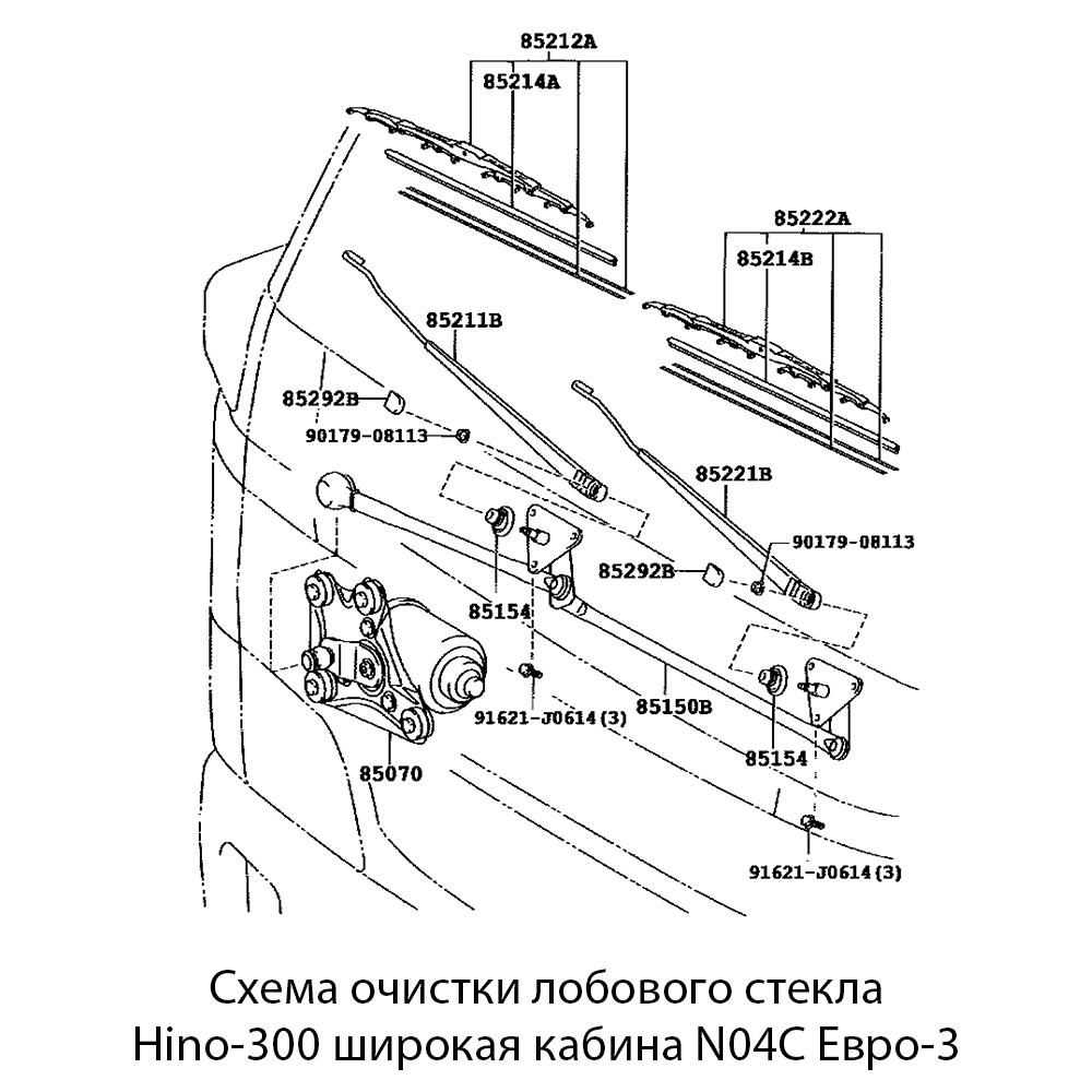 Левый поводок стеклоочистителя для Hino-300 с широкой кабиной и двигателем N04C, экологический класс Euro-3. Обеспечивает правильное крепление щётки и качественное удаление загрязнений с лобового стекла.