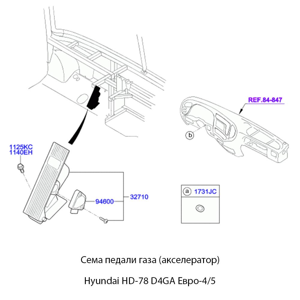Электронная педаль акселератора предназначена для автомобилей Hyundai HD-78, оснащённых дизельным двигателем D4GA, сертифицированным по экологическим стандартам Евро-4 и Евро-5. Она оснащена чувствительным датчиком, мгновенно реагирующим на изменение положения педали и передающим сигналы в электронный блок управления двигателем.
