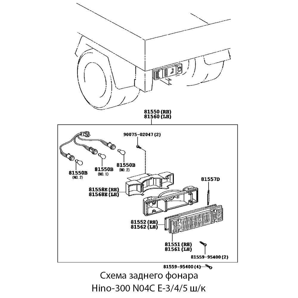 Задний фонарь установлен на правой стороне заднего бампера автомобиля Hino-300 с двигателем N04C и системами выпуска Евро-3/4/5. Отвечает за сигнализацию стоп-сигнала, поворотников и задних габаритов, обеспечивая видимость автомобиля другим участникам движения.