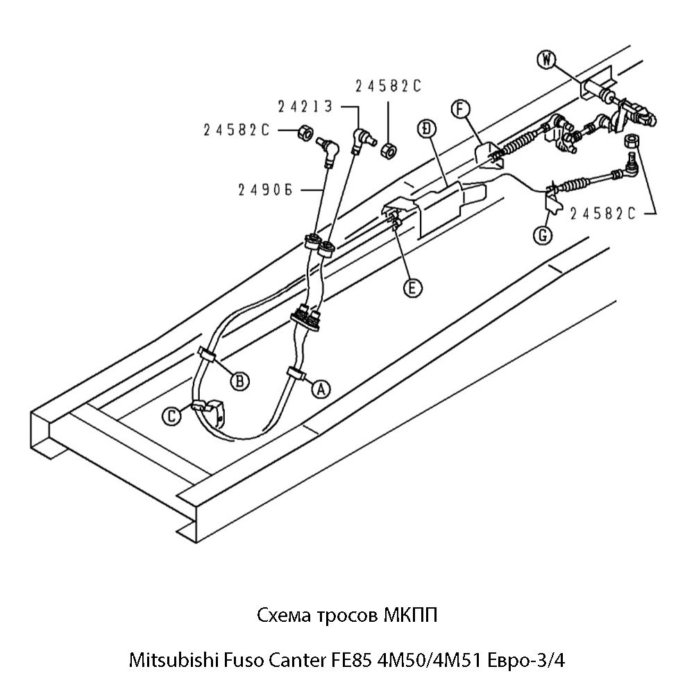 Трос предназначен для дистанционного переключения передач автомобилей Mitsubishi Fuso Canter FE85 с двигателями 4M50/4M51 и стандартами Евро-3/4. Обеспечивает связь между ручкой переключения передач и коробкой передач, передавая усилие без потерь.