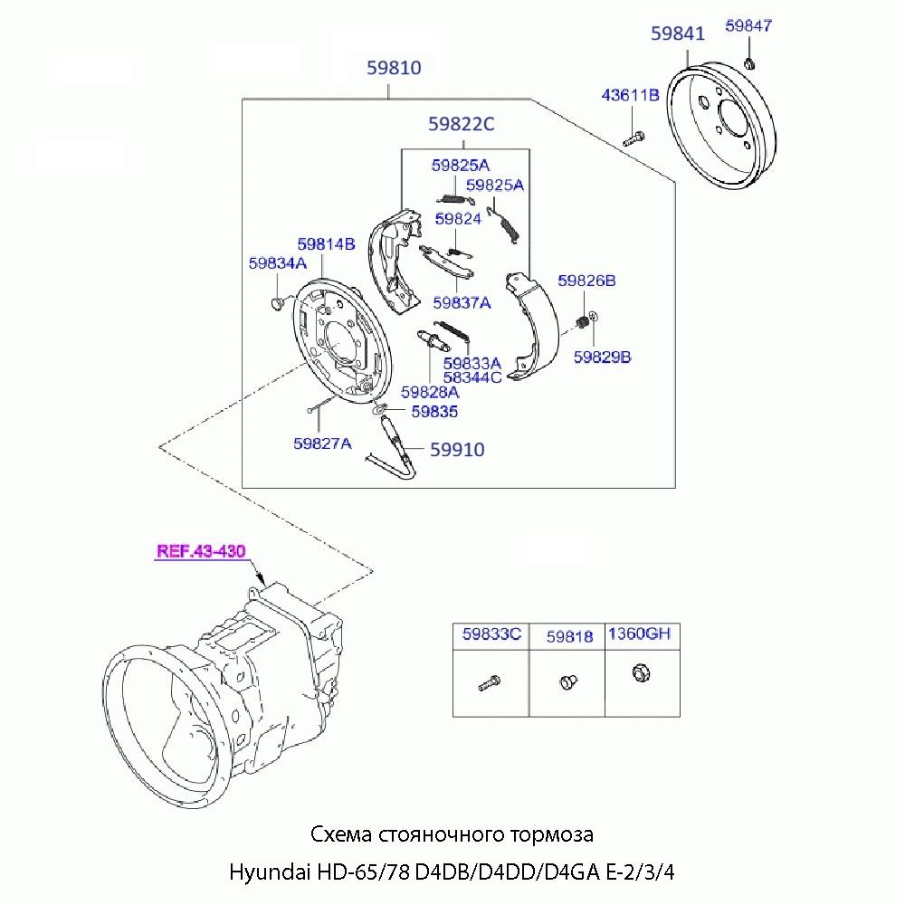 Оригинальный трос стояночного (ручного) тормоза для автомобилей Hyundai HD-65 и HD-780 с двигателями D4DB, D4DD, D4GA и экологическими стандартами Евро-2, Евро-3, Евро-4.